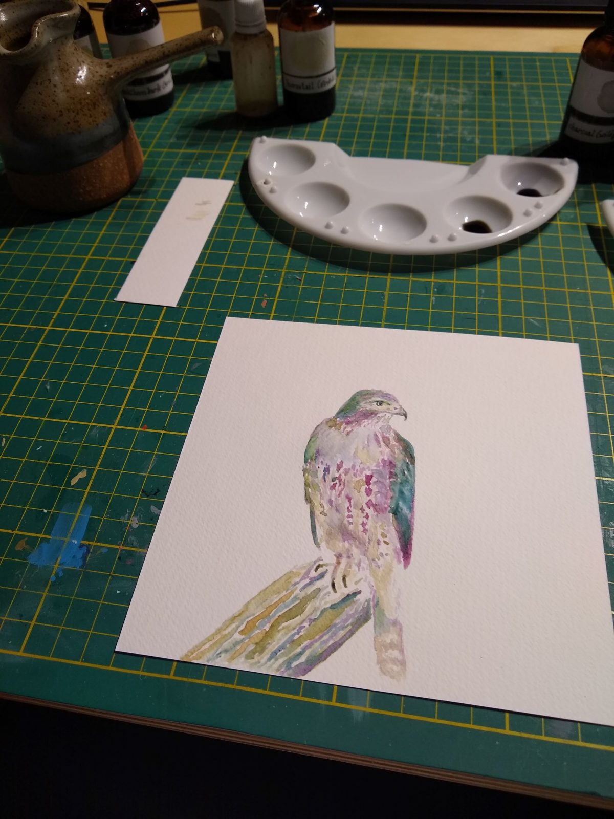 The more I use this wild palette, the more I understand it, but it is also made of organic matter, and full of surprises. So when I paint with these inks, I am not 100% in control, and, more and more, I am not trying to be. I would like to paint a hawk, but the exact how and what of the hawk, that remains to be seen. I discover it along the way. It’s an exercise in exploring what is possible with what is at hand. This practice in letting go is good for my brain, which, like the brains of so many other humans, is so much more comfortable with hanging on.